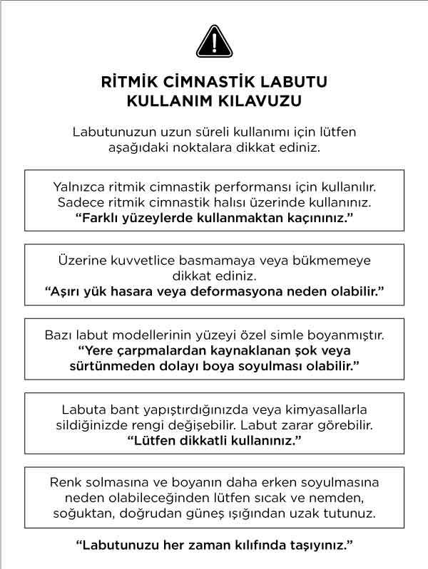Labutunuzun uzun süreli kullanımı için lütfen aşağıdaki noktalara dikkat ediniz. - Sadece ritmik cimnastik halısı üzerinde kullanınız. “Farklı yüzeylerde kullanmaktan kaçınınız.”