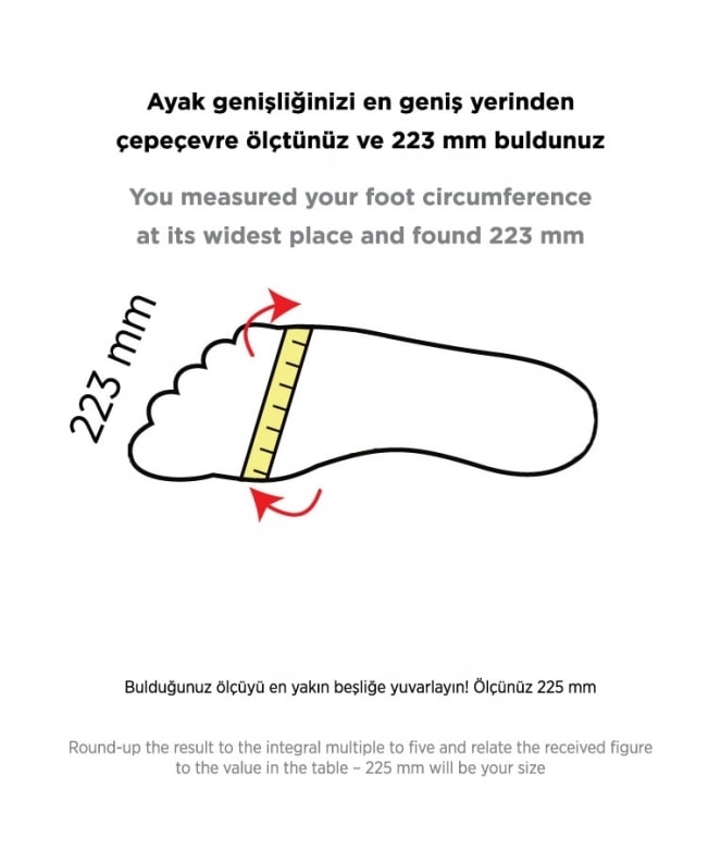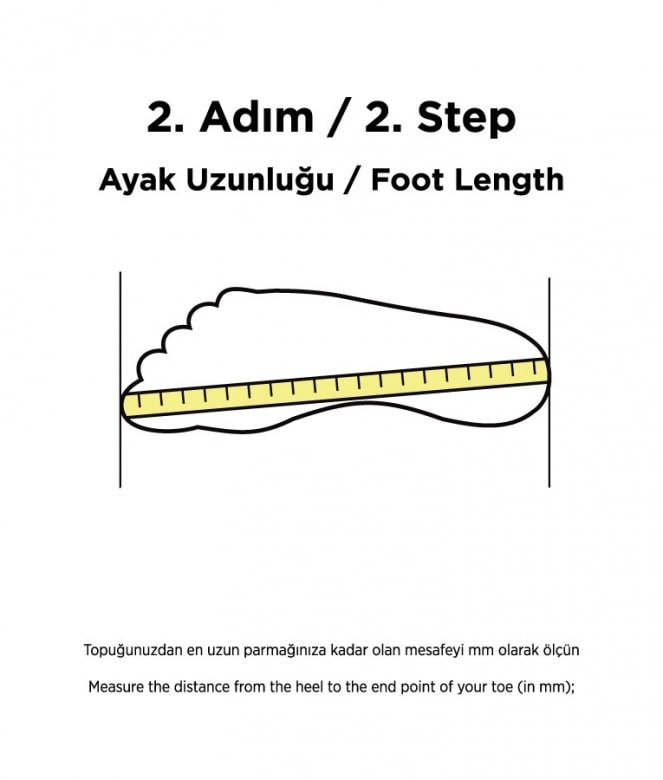 Ölçünüzü belirleyebilmek için yere ayaklarınızın sığabileceği bir büyüklükte kağıt koyun ve her iki ayağınızla üzerine basın. Kesinlikle dik bir açı ile ayağınızın kapladığı alanı kalem ile çizin. Topuğunuzdan en uzun parmağınıza kadar olan mesafeyi cetvel yardımıyla ölçün ve not edin. Bulduğunuz ölçüyü aşağıdaki tablodan Grishko numaranızı bulmak için kullanın.