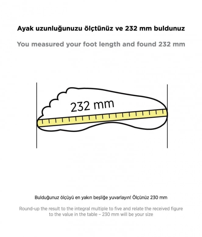 To know your size put a sheet of paper on the floor, place your foot on it in a strictly perpendicular way leaning yourself steadily on both feet, and mark the foot outline with a pencil. Take a rule and measure the distance between the most protruding point of the heel and that of the first or second toe. Find the corresponding figure in mm in our table and thus determine your size.