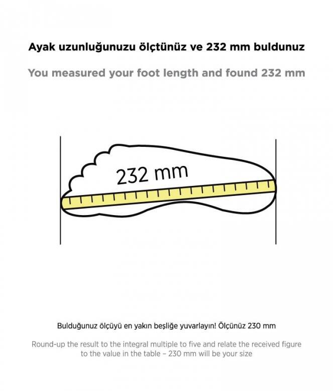 • Ayakkabının uzunluk ölçüsünü belirlemek için topuğunuzdan en uzun parmağınıza kadar olan mesafeyi mm olarak ölçün