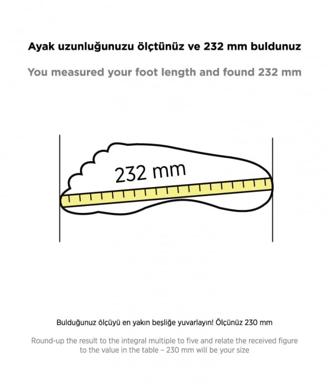 To know your size put a sheet of paper on the floor, place your foot on it in a strictly perpendicular way leaning yourself steadily on both feet, and mark the foot outline with a pencil. Take a rule and measure the distance between the most protruding point of the heel and that of the first or second toe. Find the corresponding figure in mm in our table and thus determine your size.