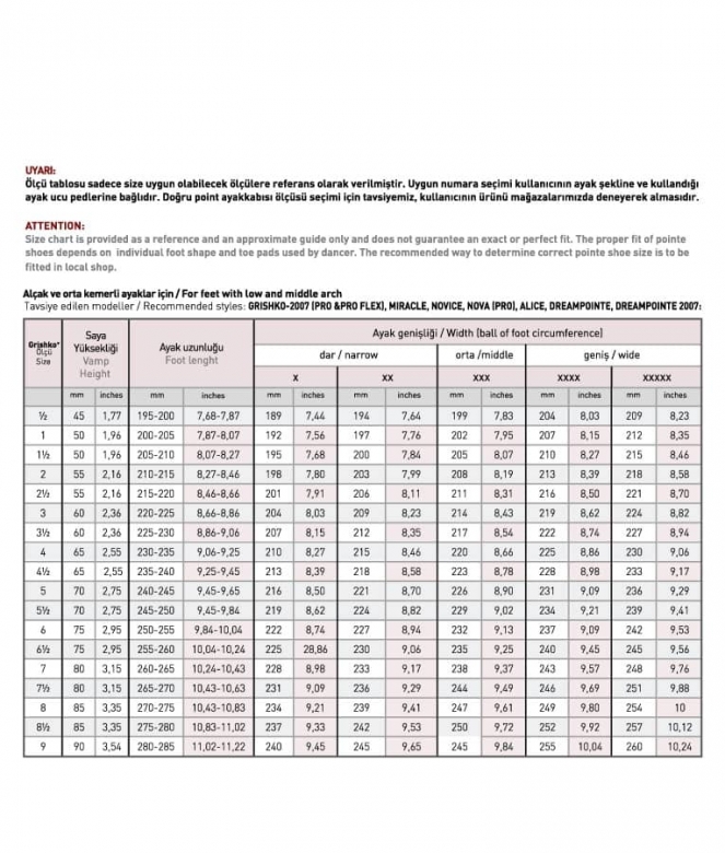 Width: In order that the pointe shoe could fit your foot perfectly, the Grishko Ltd. manufactures ballet pointe shoes in a variety of 5 widths in each size. If you try on a pair of pointe shoes for the first time and do not know the right width, ask your teacher for advice or choose a medium width. Please have in mind that the foot sweat stretches the shoe fabric while dancing. Thus, in a couple of hours the pointe shoe will take the form of your forefoot.