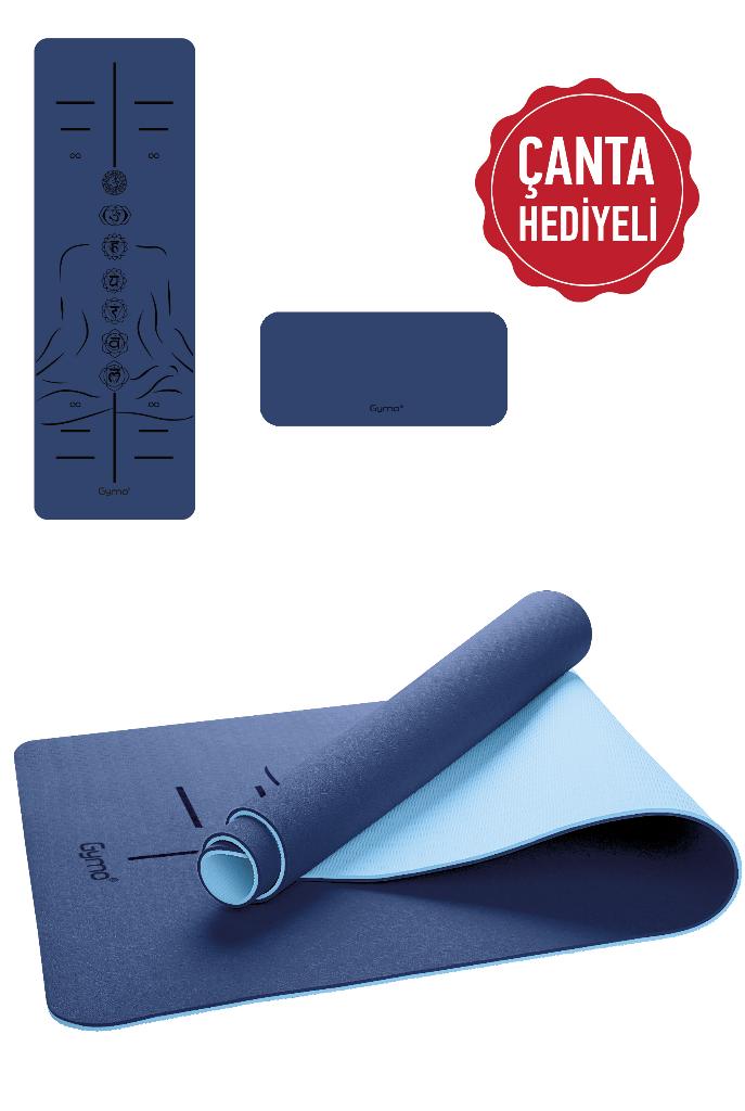 Gymo Sembol Hizalamalı 6mm TPE Yoga Matı Pilates Minderi Diz Dirsek Koruyucu Matlı Set Mavi
