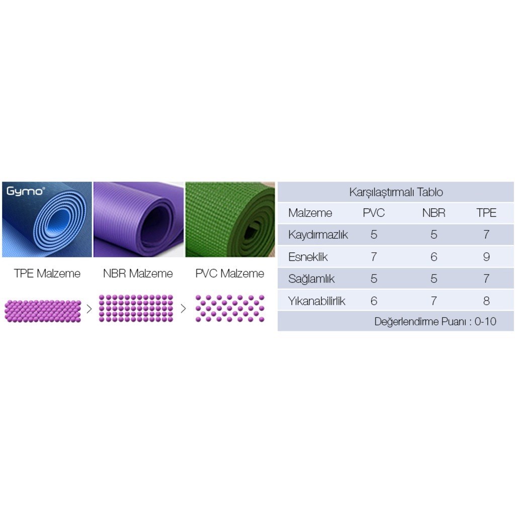 • YENİ ÇEVRE DOSTU MALZEME: Geliştirilmiş Gymo Yoga matı, çevre dostu birinci sınıf TPE malzemeden üretilmiştir. Üretim maliyeti daha fazladır, ancak çevre dostu olmayan PVC, NBR ve EVA yoga matlarıyla karşılaştırdığınızda buna değer. TPE geleneksel yoga matlarına kıyasla en son teknolojik gelişmeyi sunan malzemedir.